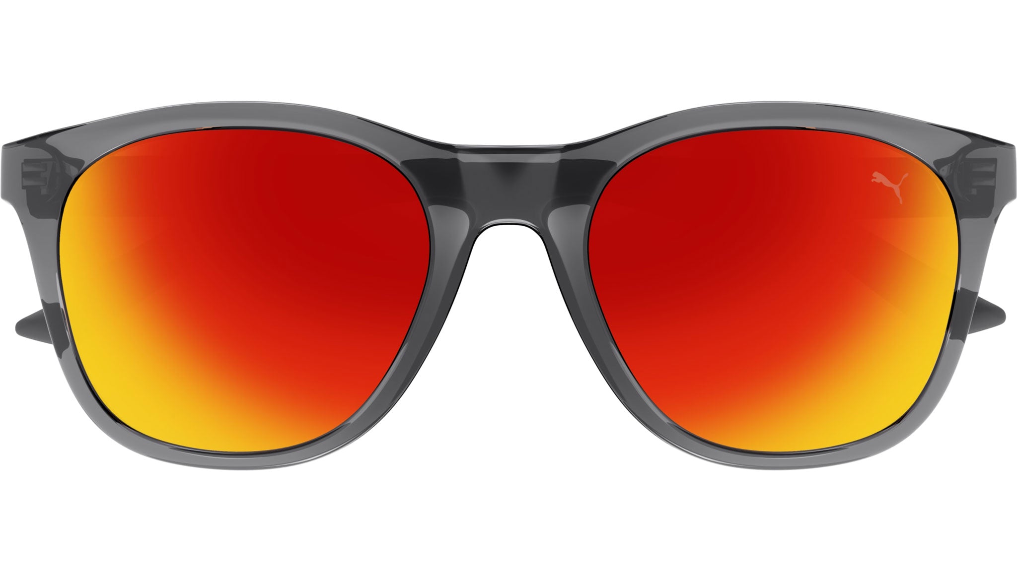 Occhiali da sole Puma Tweens modello PJ0074S variante colore 003 grigio scuro trasparente lucido con lenti color grigio fumo specchiato rosso.