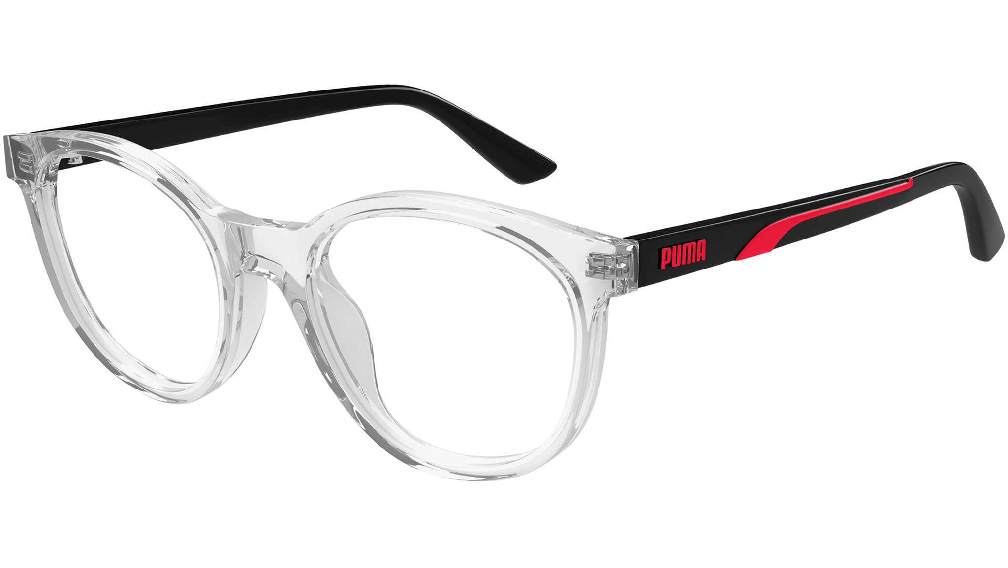 Occhiali da vista Puma Junior modello PJ0078O variante colore 003 cristallo lucido con lenti demo. Rivenditore autorizzato Puma online. Gli occhiali vengono consegnati con custodia e accessori originali e sono coperti dalla garanzia ufficiale di 12 mesi del produttore.