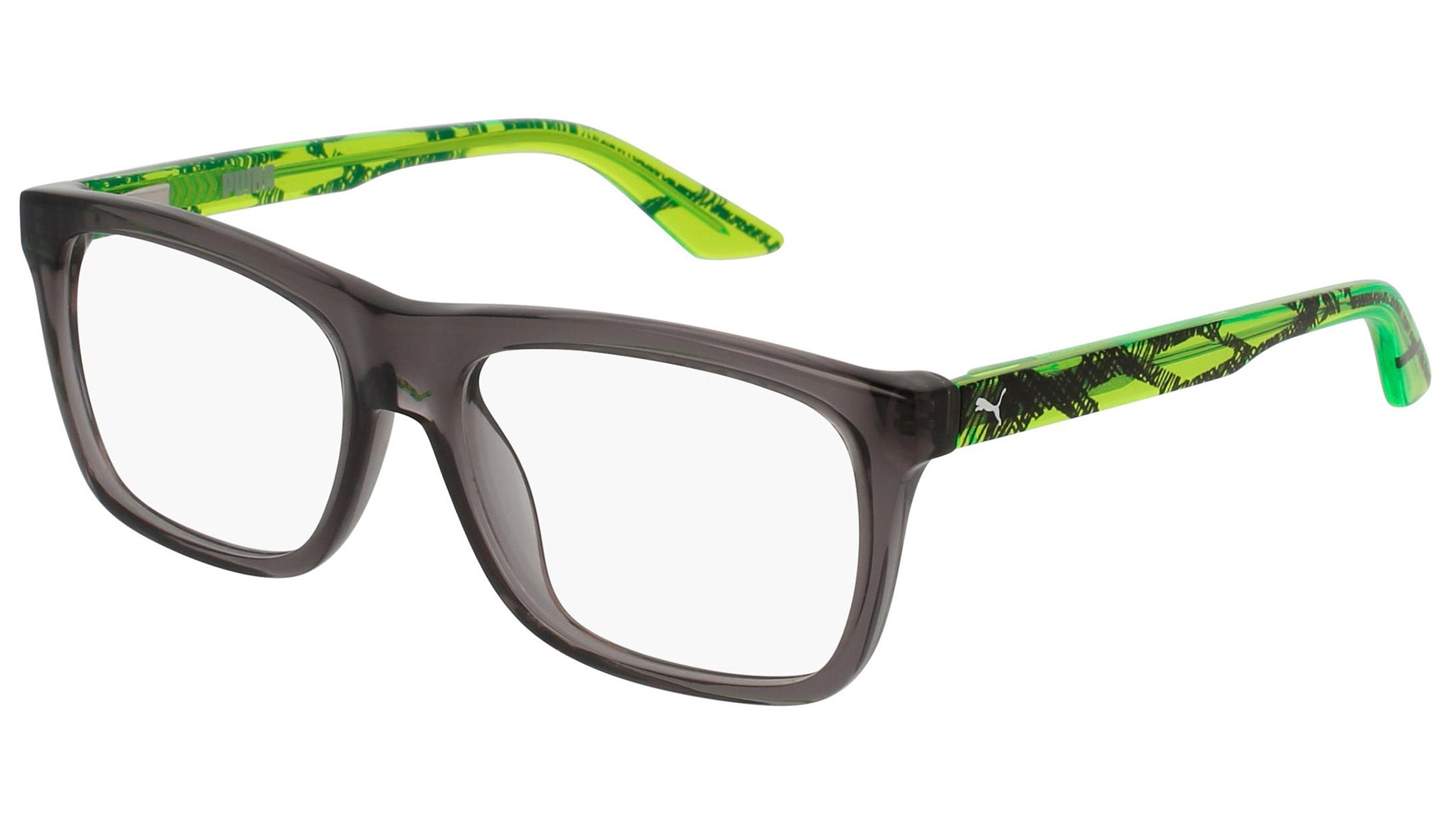 Puma for Kids model PJ0008O 003 transparent dark grey optical frame. These kids are on the move. They roam the streets in search for recognition, emotions and daily kicks: celebrating with friends at the Luna Park, a thrilling jump, a trick on a skateboard, or simply seeing something new.