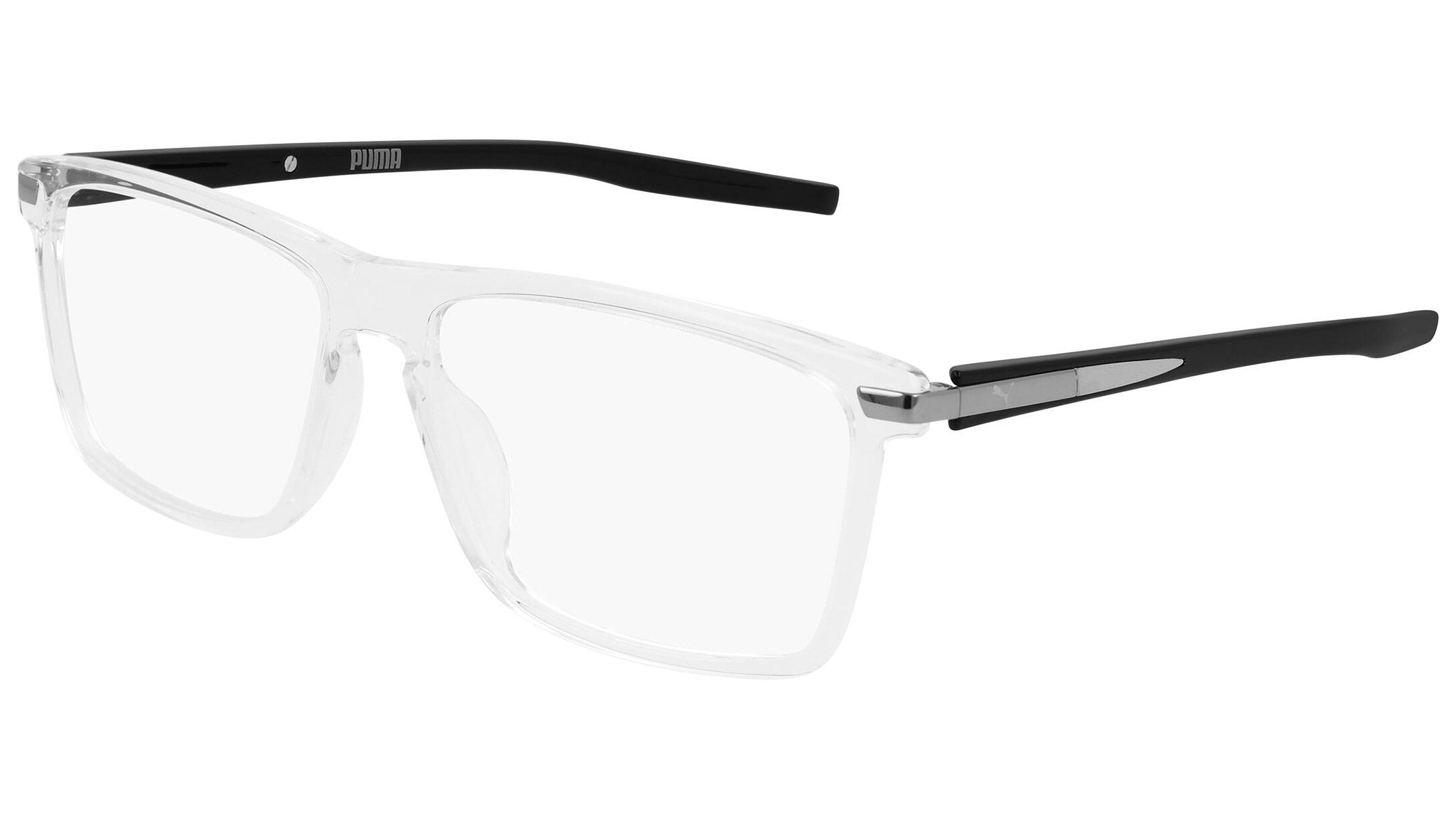 Puma Eyewear model PU0257O 003 shiny crystal optical frame. Made to move. Masculine rectangle shape, pop of color in metal inserts on temples.