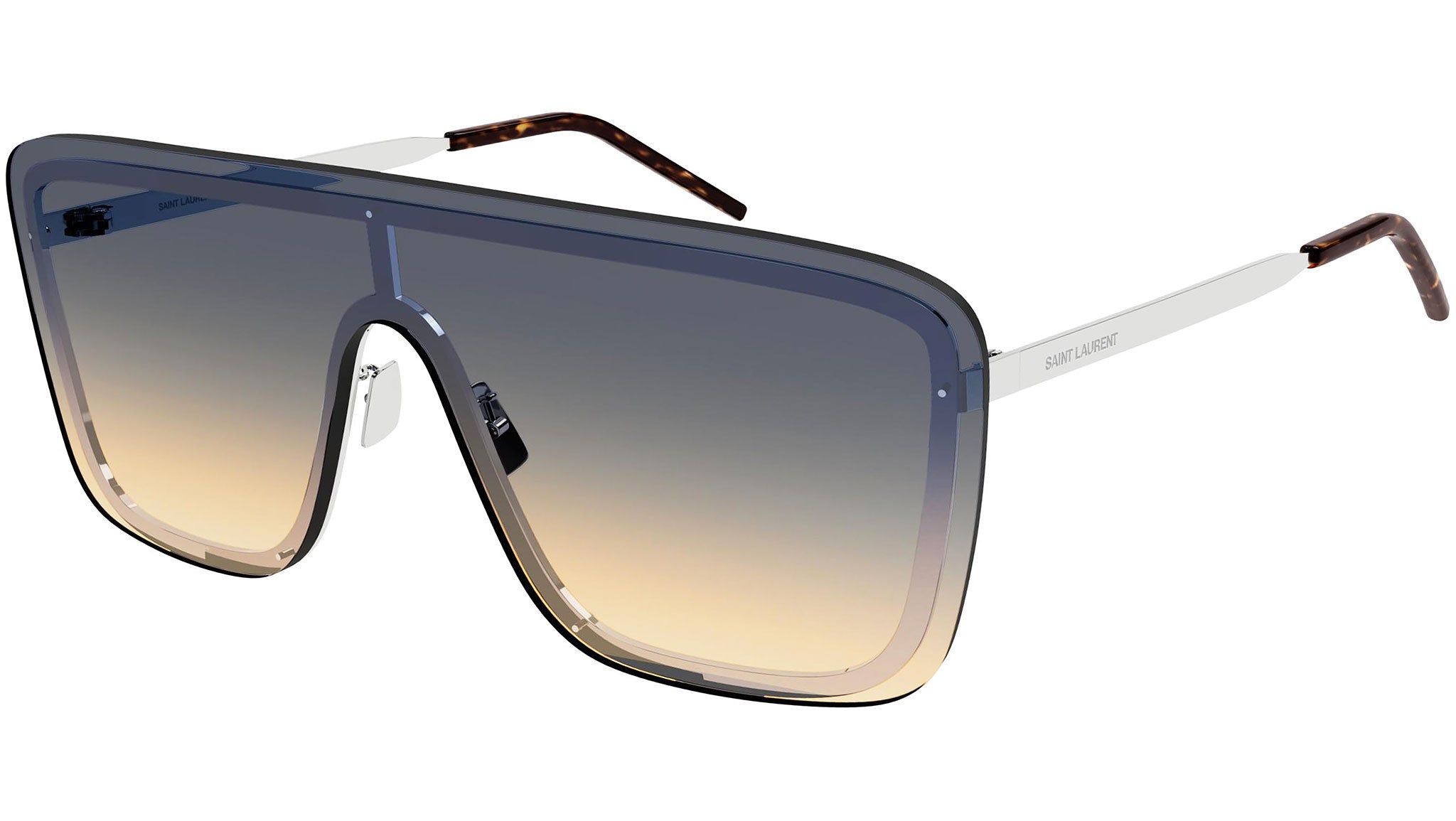 Occhiali da sole Saint Laurent linea New Wave modello SL 364 MASK 009, variante colore argento lucido con lenti color doppia sfumatura petrolio e nude. Saint Laurent Eyewear rappresenta in pieno le attitudini uniche del brand: stile senza tempo coniugato a un moderno concetto di lusso. La collezione YSL di occhiali da sole offre una raffinata selezione di prodotti unici, contraddistinti da una qualità inarrivabile.