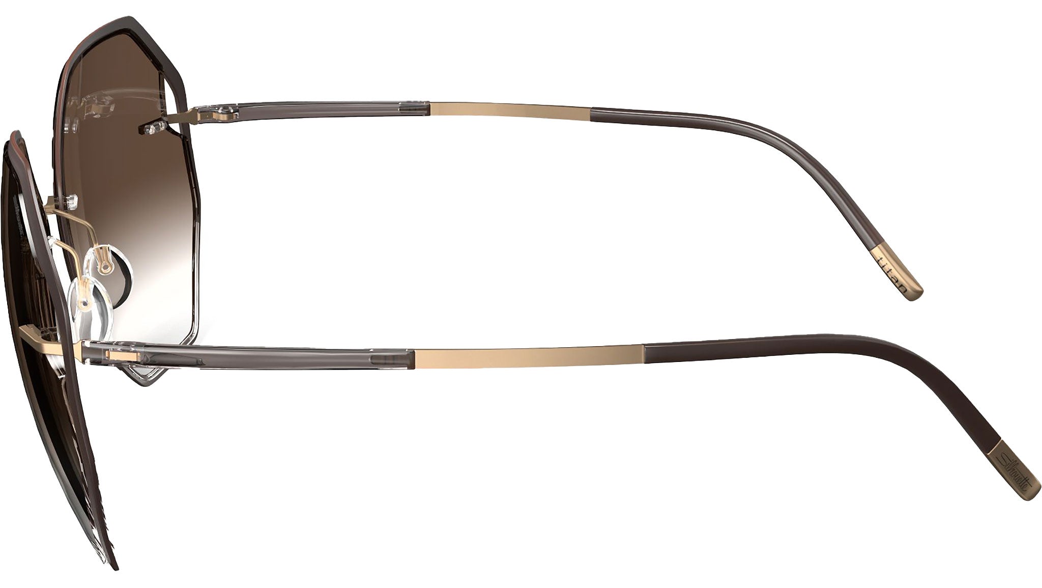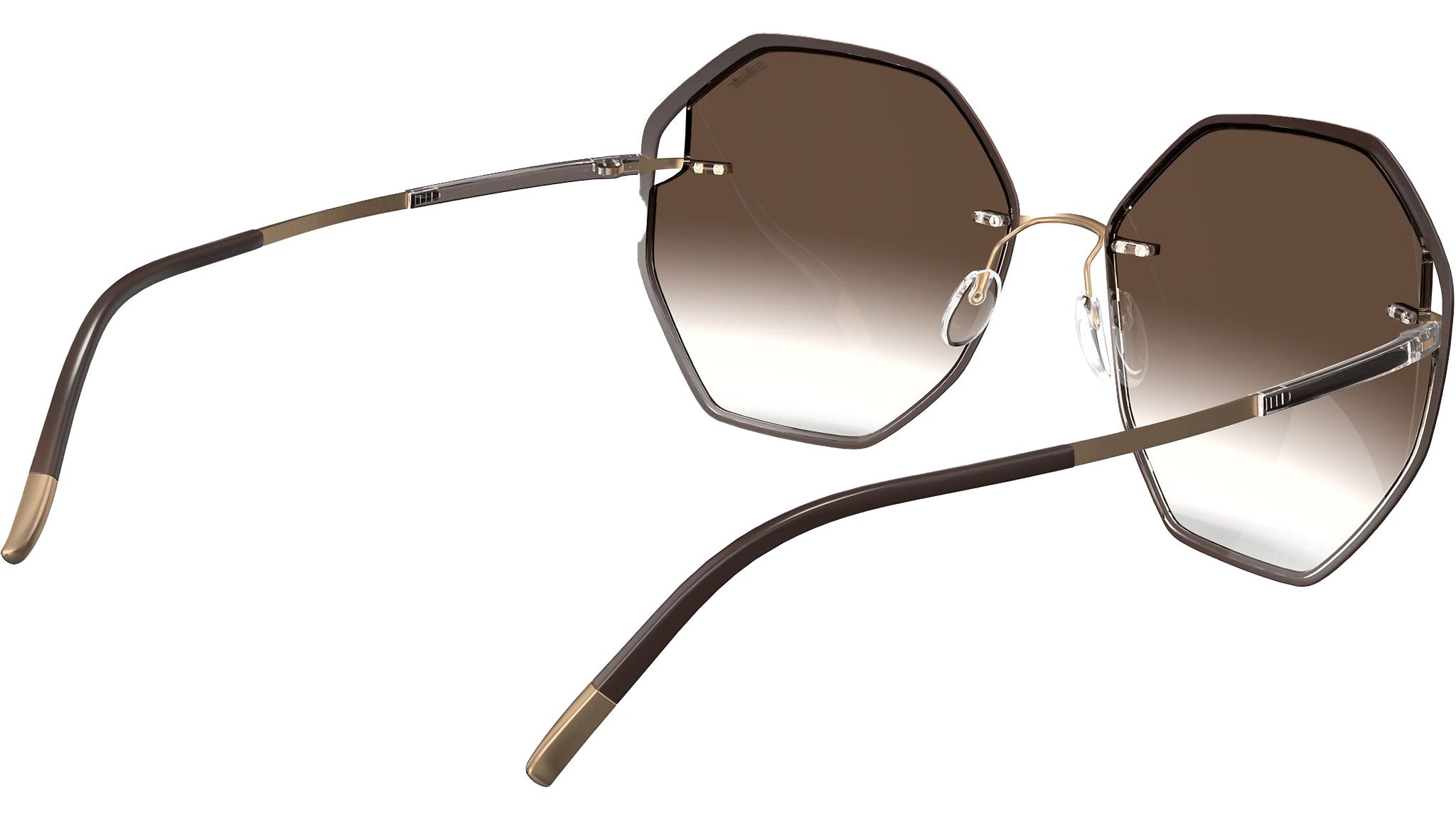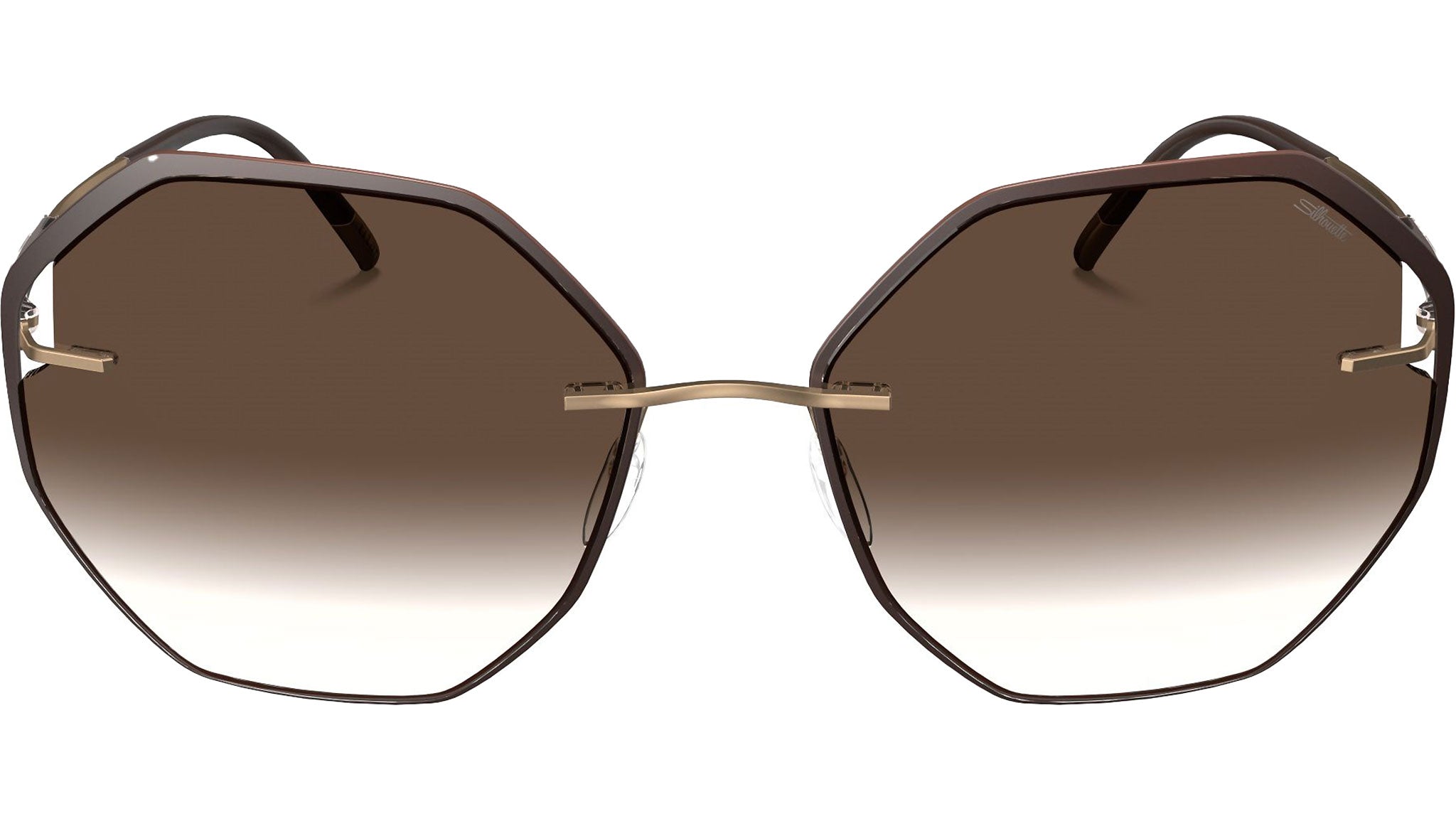 Silhouette Accent Shades 8187 in 6030 frame color featuring classic brown gradient lenses. The Sant Martí showcases a contemporary octagonal lens shape, emphasized by Accent Rings that wrap around the lens to highlight its unique design. Clever side cut-outs provide optimal comfort and support by allowing precise positioning of the temples. These glasses offer superior comfort, are hypoallergenic, and crafted without screws, with a base 6 curvature. Their lenses feature Silhouette's innovative Light Management® technology, an anti-reflective coating on the backside, and high-impact polycarbonate construction, providing full UV A, B, and C protection, equivalent to UV 400. The Silhouette Light Management® technology ensures 100% UV protection, significant anti-glare protection, and enhanced colors. These glasses come in traditional sunglasses colors: grey, brown, and green.