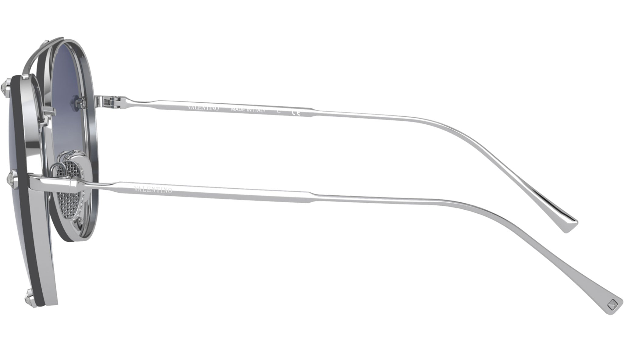 Occhiali da sole Valentino modello VA2045 variante colore 30064L argento, con lenti color blu sfumato. Fondata a Roma nel 1960, la Maison Valentino è una delle espressioni più alte del savoir faire couture e dell’eccellenza che hanno reso il made in Italy famoso nel mondo. Le collezioni Valentino eyewear esprimono l’eleganza senza tempo della Maison in un perfetto equilibrio tra tradizione ed innovazione nel pieno rispetto degli iconici valori del brand.